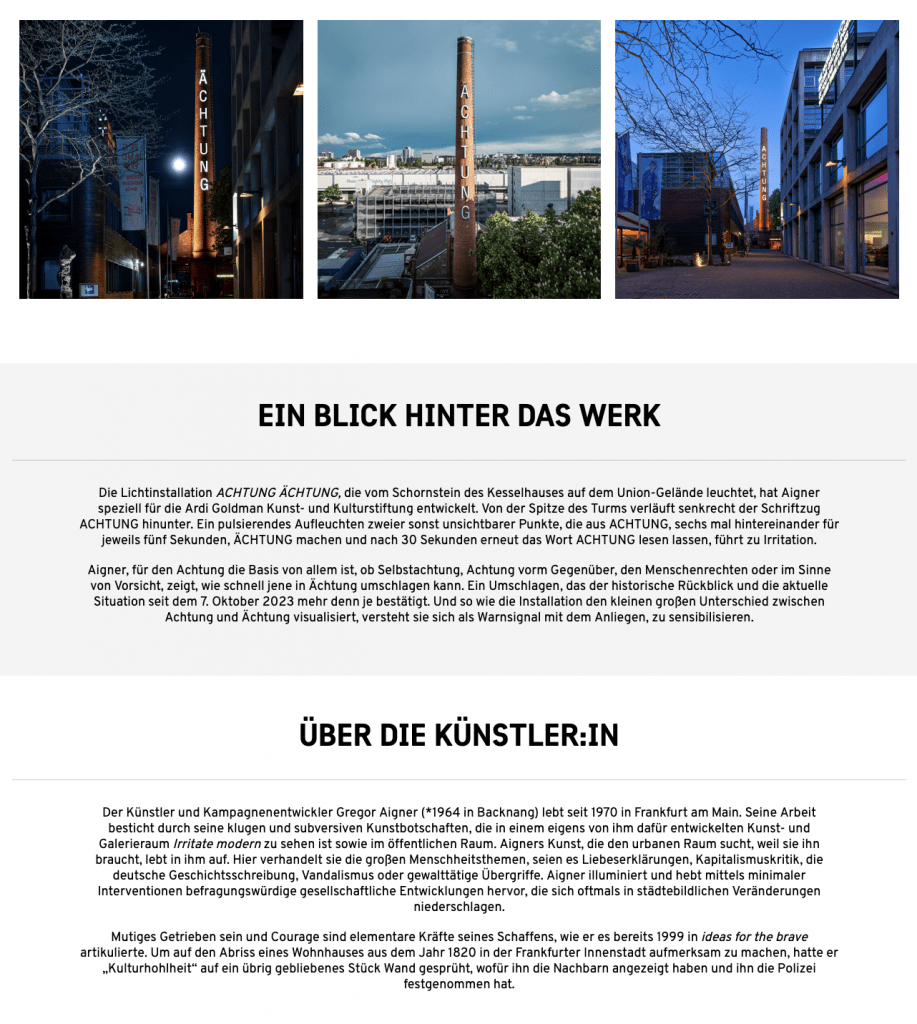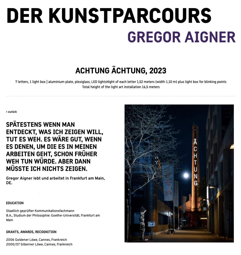 ACHTUNG|ÄCHTUNG ist zur rechten Zeit entstanden. „Kunst ist Widerstand“ sagt Ardi Goldman und eröffnet nach und nach ein Museum in Frankfurt (Union-Areal), kuratiert von Celena Ohmer. Eine Vision, die das vielschichtige, künstlerische Werk von Gregor Aigner möglich gemacht hat. Auf einem ehemaligen Brauerei-Gelände kommt man nicht um die Formulierung umhin, dass sich gerade wieder etwas zusammenbraut.