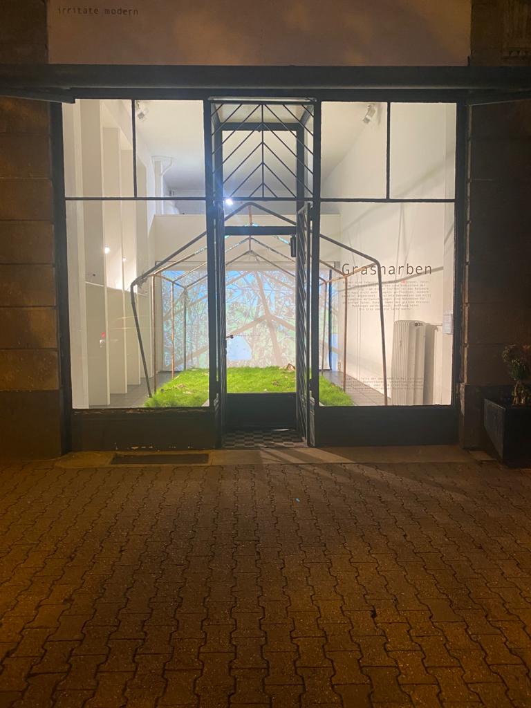 Die Fläche der Installation ist genau auf die Maße der Verkaufsfläche des ehemaligen Bücherstandes begrenzt. Das Gestänge scheint im ersten Moment Halt zu geben. Schon nach wenigen Sekunden spürt man jedoch die Halt-, Hilfs- und Tatenlosigkeit, die über die Grasnarben wehen. Am liebsten würde man sich zu den Bücherresten in das saftige Gras legen, sie umarmen und von ihnen umarmt werden. Was jedoch den Prozess der Verschleierung, des Vergessens und der Verdrängung zerstören würde. So macht man eben das, was alle machen: Abwarten, bis auch über dieses Thema niemand mehr redet, was soll man denn auch tun? Die Abhängigkeit von gesellschaftlichen Normen erfordert geradezu diese Vorgehensweise.