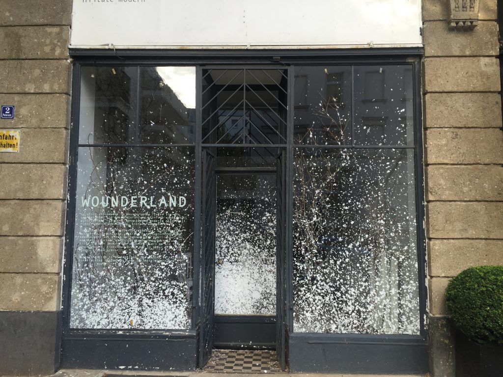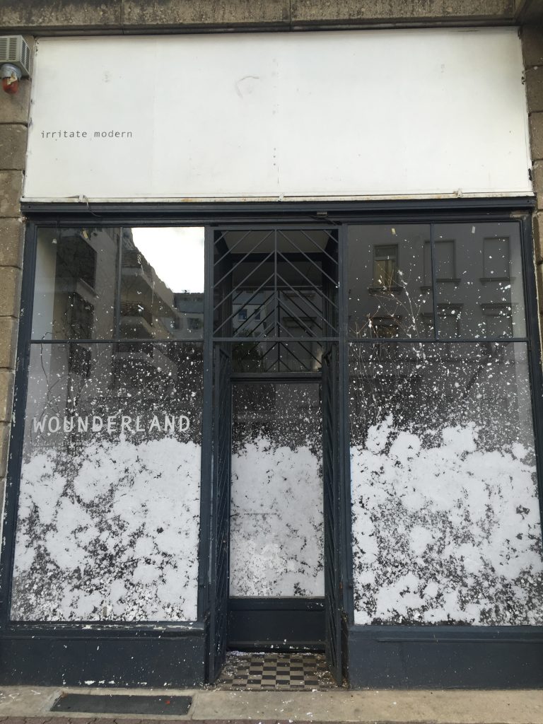 The pulp of twelve servings of litigation was splattered during the Wounderland© exhibition period. The gallery window and the exhibition text were covered in deepening layers of “snow”. The same feeling sets in when you get into the centrifuge of interpersonal terror. Everything changes beyond recognition.