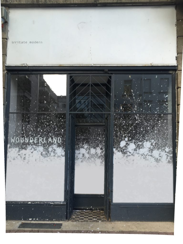 Schaufenstertext: WOUNDERLAND Herzlich willkommen im Wounderland. Treten Sie ein und genießen Sie den Winteranfang. Einfach wundervoll. Winteranfang ist dann, wenn jemand anderes es so will. Plötzlicher Niederschlag. Einfach wundenvoll.